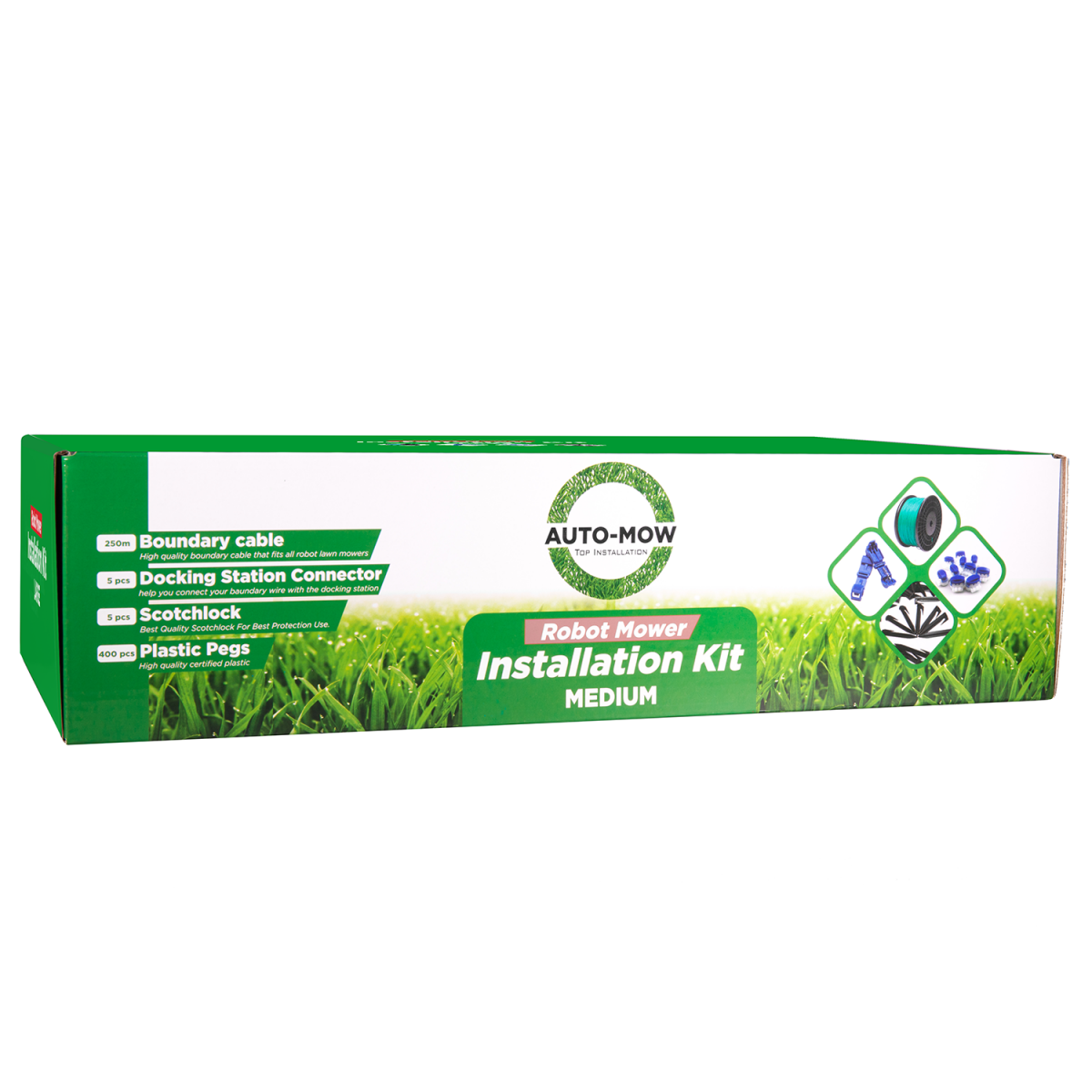 - Ez az installációs kit robotfűnyírók telepítésénél felhasználható a terület behatárolásakor határoló vezetékként, vagy vezetőszálként, keresőszálként telepítve is
