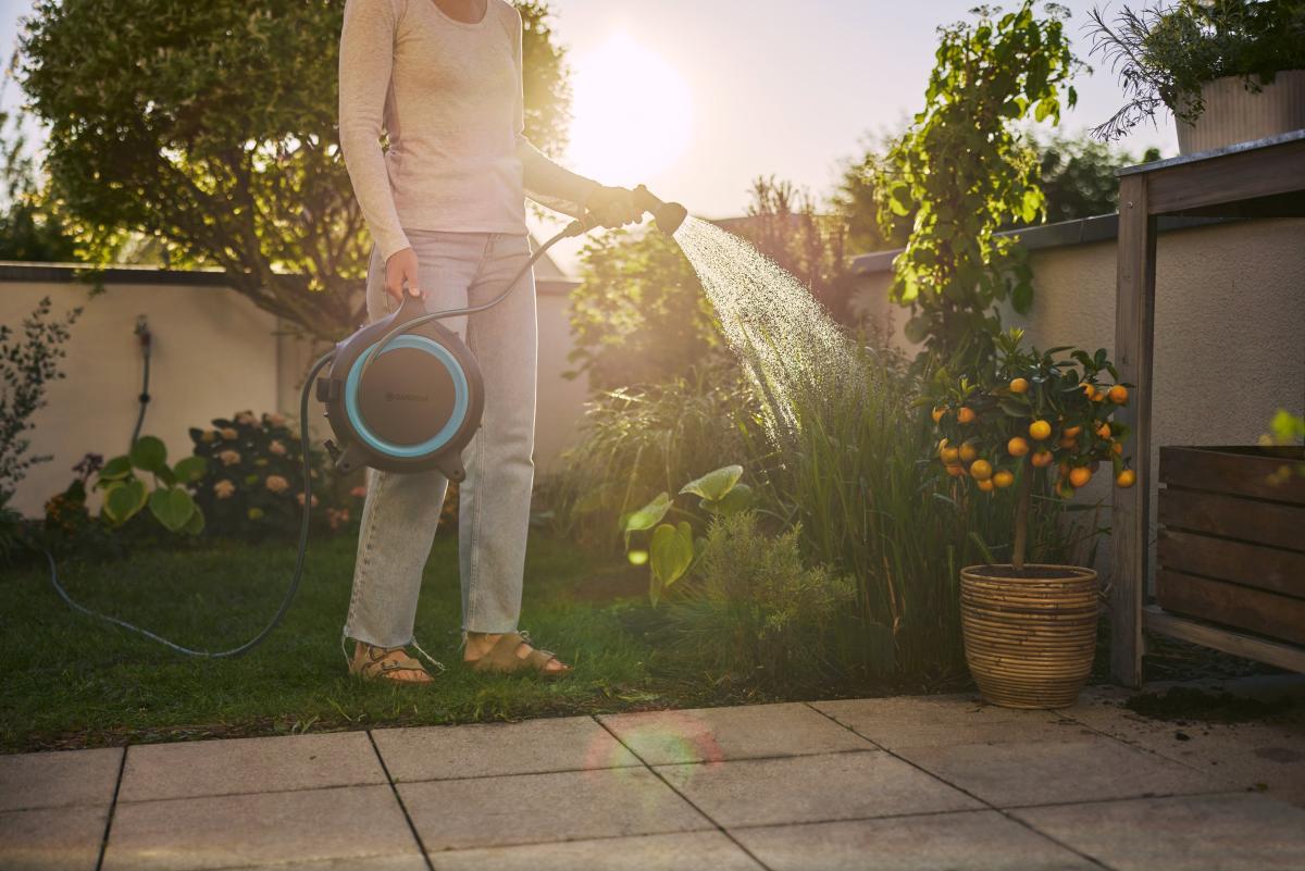 - Közeli területek öntözése: A 12,5 m-es csatlakozó tömlő a 1,5 m-es vezeték tömlővel kis területek öntözése közben tekerhető ki.